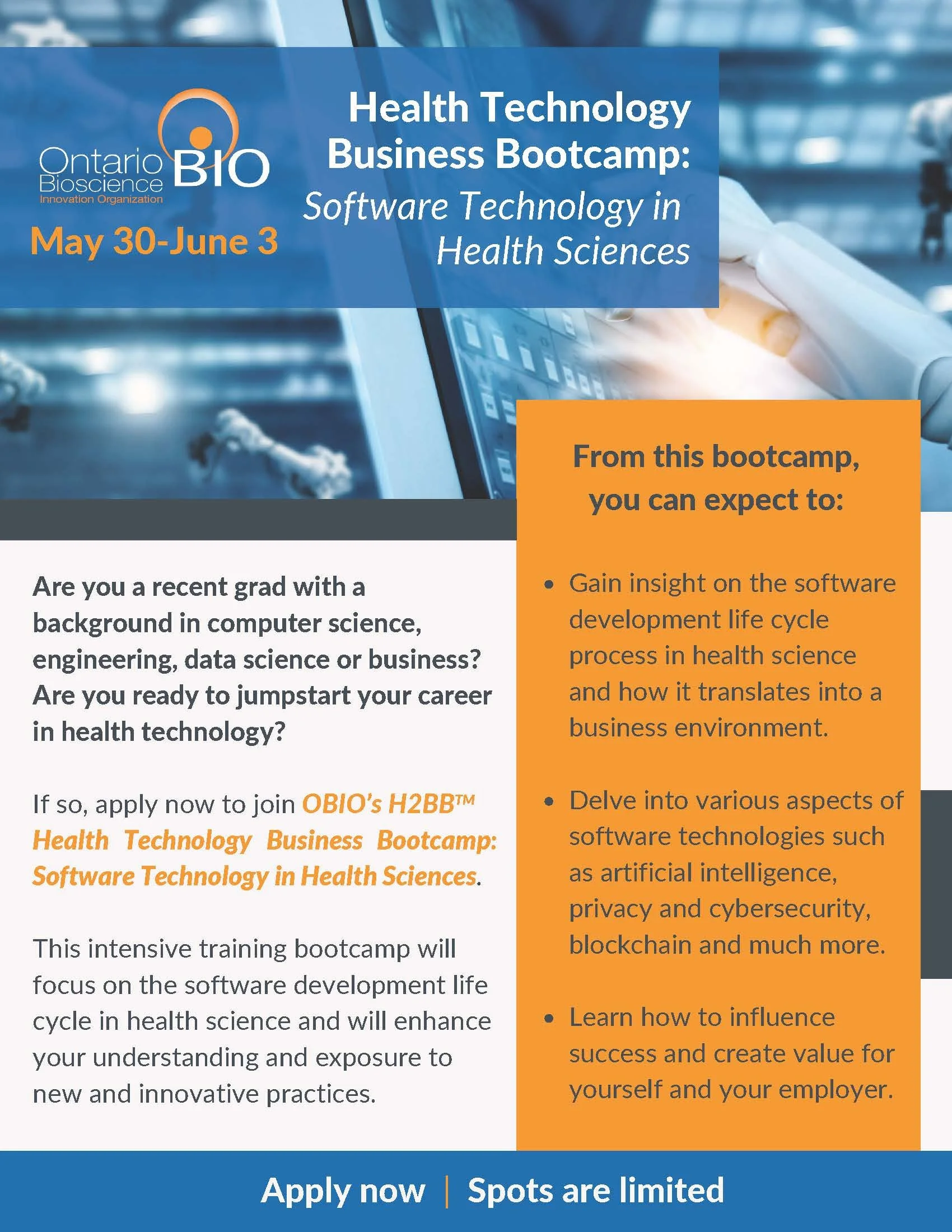 OBIO’s Health Technology Business Bootcamp: Software Technology in Health Sciences Monday, May 30, 2022 9:00 AM Friday, June 3, 2022 5:00 PM Ontario Bioscience Innovation Organization 100 College St., Suite 213 Toronto, Ontario, Canada M5G 1L5 (map) Google Calendar ICS Apply now