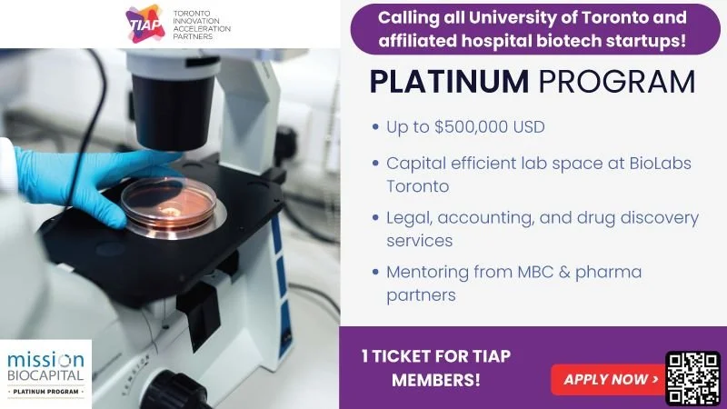 TIAP has partnered with Mission BioCapital on their Platinum Program, with winners of their Platinum Ticket receiving up to $500K in pre-seed capital, lab space at the new BioLabs University of Toronto and mentorship from the accomplished MBC team and their amazing slate of sponsors.