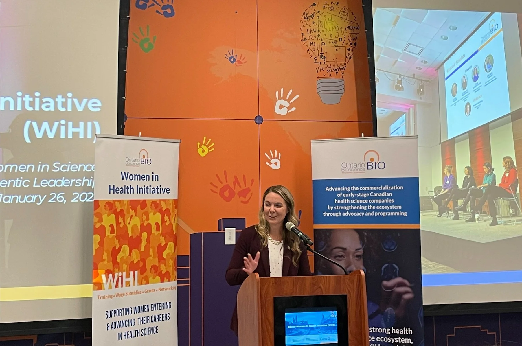 Dr. Maura Campbell, President and CEO of OBIO®, then greeted the audience and described the important contributions by the WiHI program to increasing the participation and advancement of women in the health science sector since the program’s launch in July 2022. The OBIO® WiHI program supports women entering and advancing their careers in business development roles in the health science industry through a combination of on-the-job learning and financial support. Dr. Campbell applauded the Ottawa health sciences ecosystem of colleges, universities, hospitals and organizations for fostering the next generation of health science companies.