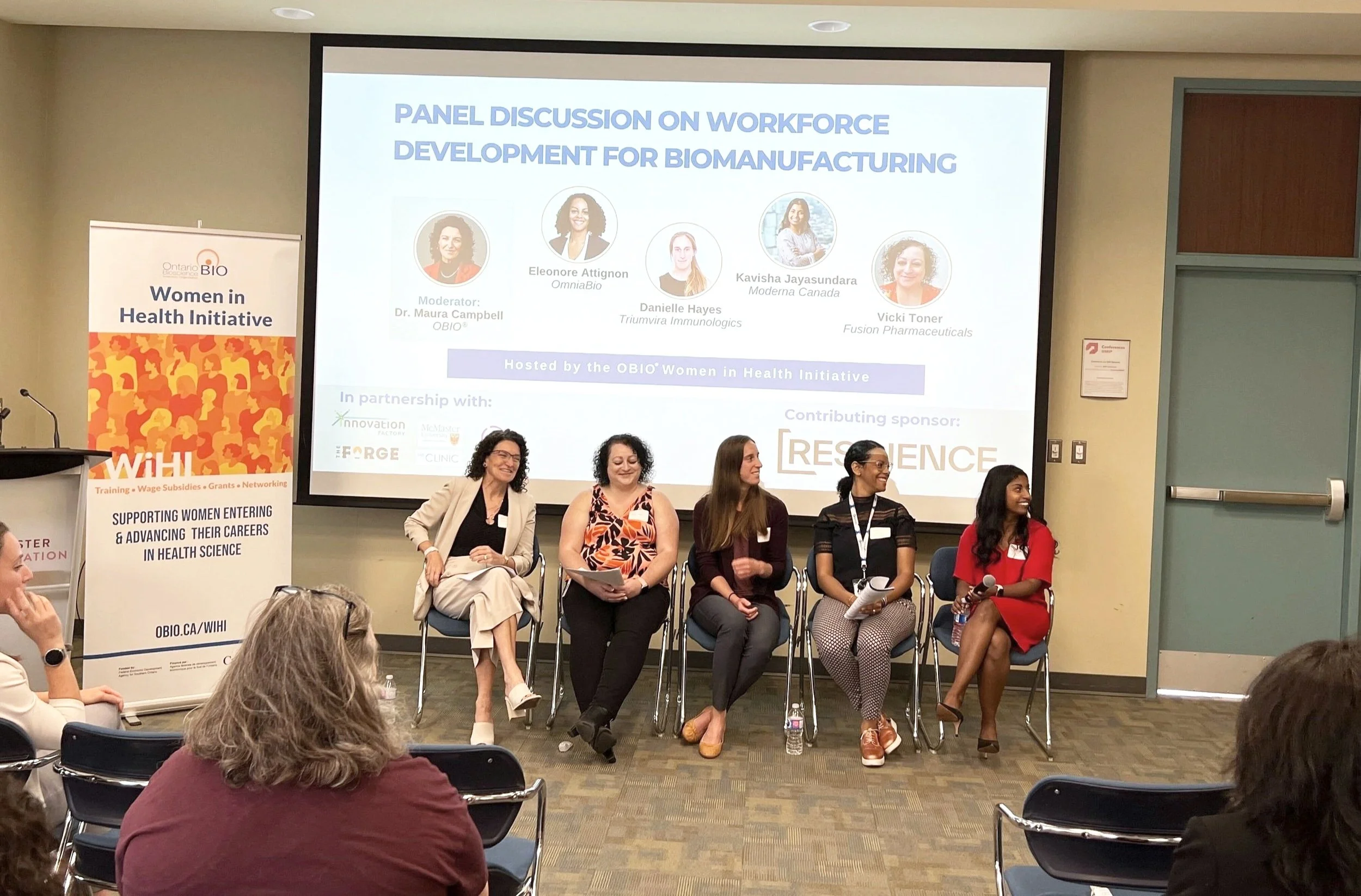 On June 20, 2023, the OBIO® Women in Health Initiative (WiHI) hosted “Connecting Women in Health in Hamilton”, sponsored by Resilience and in partnership with McMaster Industry Liaison Office (MILO), Innovation Factory, The Forge, The Clinic and Synapse Consortium. The event featured a morning panel discussion on “Workforce Development in Biomanufacturing,” a networking lunch for women at all stages of their career and a workshop on “Fundraising for Women-Led Health Science Companies.”