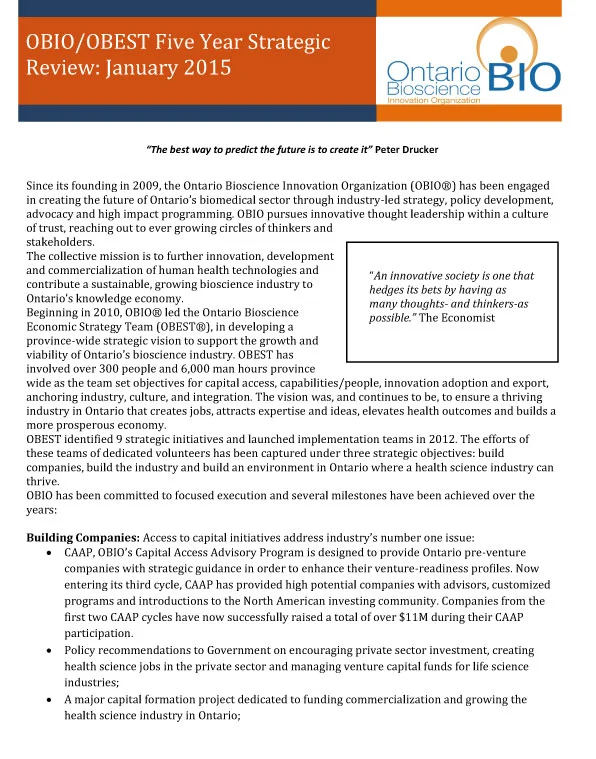 OBIO Reconciles Ontario Bioscience Economic Strategy (OBEST)